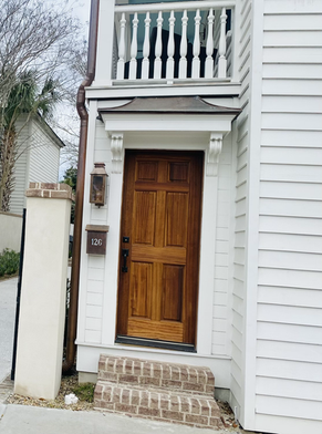 The siding will be repaired and the exterior will be painted a warm white. The exterior doors will be beautiful hardwood, which will match the tongue and groove boards on the porch ceilings. Light fixtures will be replaced and fans will be added. Bright green ferns will add a pop of color.