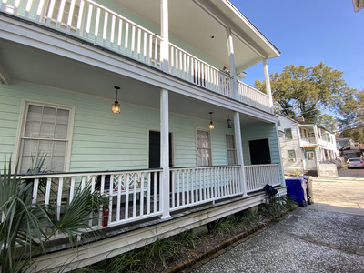 The current exterior is painted aqua blue with some areas of wood rot. There are two large porches just screaming for TLC.